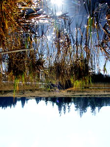 This image captures the serene beauty of a rural landscape, where the calm water mirrors a tree in an outdoor setting. The sun's rays create an atmospheric effect on the surface of the water, adding to the tranquility of the scene. The colors in this photo are rich and vibrant, with shades of green from the foliage and blue from the sky.