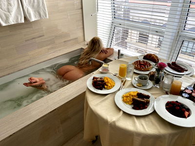 An OnlyFans model named Maya DUTCH is seen relaxing in a bath, surrounded by plates of food. This image suggests a luxurious and indulgent atmosphere. The watermark indicates it's from Worldwide.