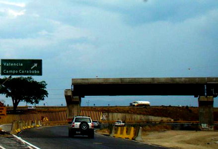 This image captures a moment on a highway overpass in Venezuela. The overcast sky suggests an impending storm, while the road sign reads 'Valencia'. This scene encapsulates the daily life of Venezuelans as they navigate through their country's ever-changing landscape.