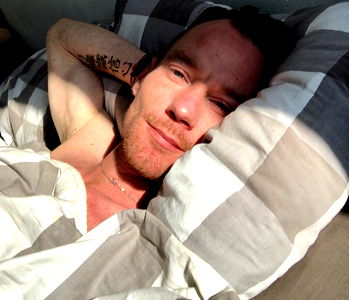 The image shows a OnlyFans model, who is described as being in his late 20s to early 30s. He has short hair and a light beard. The individual appears to be smiling slightly while resting on a bed with sunlight coming through the window, creating a warm ambiance.