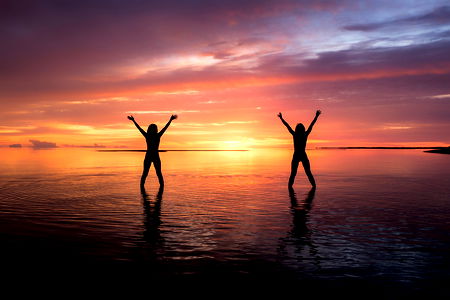 A serene and dramatic beach sunset silhouette with two figures in motion, reflecting on a calm ocean. A perfect moment for relaxation and reflection.