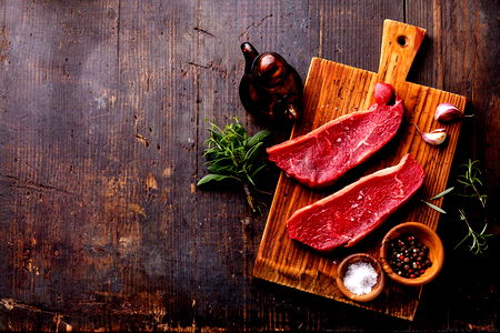 A tantalizing image of a grilled steak garnished with herbs, served on a wooden board. A bottle of sauce and a small bowl of spices are also present in the background.