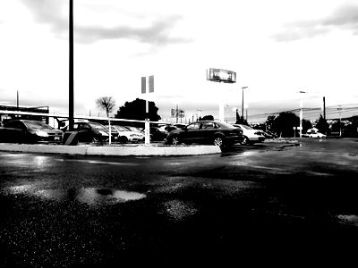 A rainy day in the parking lot of a gas station or convenience store. The scene is somewhat muted with the overcast sky and wet road. 2023.