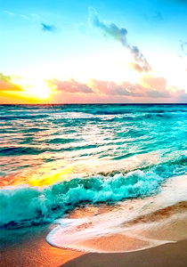 This image captures the serene beauty of a tropical beach at sunset. The warm glow of the setting sun casts a gentle light over the waves, creating an idyllic atmosphere for relaxation and reflection. The soft sandy beach meets with the tranquil ocean, inviting one to imagine the sound of the waves lapping against the shore. This picture is perfect for those who enjoy beach vacations or are looking for inspiration for travel or interior design.