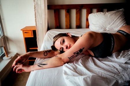 The image captures a young woman, approximately 22 years old, radiating beauty and confidence. She is captured indoors, against a wall, in the midst of a professional photo shoot. The primary focus of the portrait is her face, which exudes a warm, engaging smile and showcases her well-defined features. Her long, flowing hair adds a touch of elegance to her persona. The woman is strikingly dressed in a fashionable lingerie top, with the hint of a brassiere underneath. The top not only accentuates her slender shoulders and well-toned abdomen, but also adds a touch of sensuality to the frame. An interesting aspect of the image is the glimpse of a tattoo on her body, adding an air of mystery to her personality. The woman's outfit is thoughtfully accessorized, with a subtle fashion accessory visible, possibly a necklace. The image successfully portrays the woman as a professional model, showcasing her grace, style and the art of modeling. The image can be seen as a testament to contemporary fashion and the beauty of womanhood.