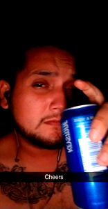 A candid selfie of a man enjoying a canned beverage. He appears relaxed and is looking directly at the camera.