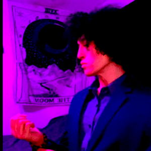Kaid Knight, a model from Arizona, USA, is captured in an introspective moment with his hands clasped. He exudes confidence and style in this purple-toned photo that includes the only fans logo and text. His unique pose adds an air of mystery to the image.