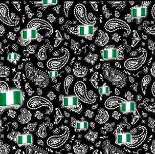 A captivating fabric design featuring a repeating paisley pattern, interspersed with unique African motifs. The pattern is in black and white, creating a striking contrast with the colorful tribal elements.