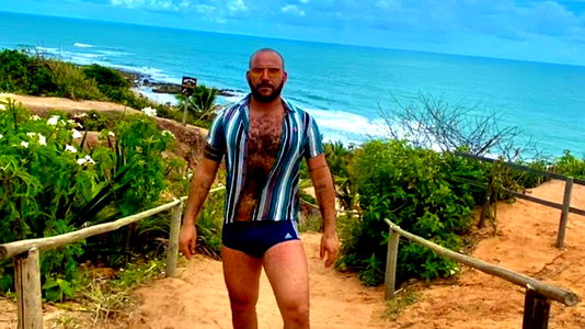 This image captures a bearded man in his late 30s in an indoor setting, possibly a bathroom. The square frame of the photo emphasizes the subject's face and upper torso, allowing for an in-depth examination of his features. The man's face, which is the central point of the image, is adorned with a thick, well-groomed beard, adding an edge to his masculine appeal. His facial expression is calm and neutral, yet there's an intensity in his eyes that is hard to ignore. The man's bare chest is visible, showcasing defined muscles that suggest frequent physical activity or exercise. His skin appears healthy and well-cared-for, a testament to good grooming habits. The background is a plain wall, possibly tiled, indicative of an indoor environment - likely a bathroom. Overall, the image exudes a quiet, reflective atmosphere, offering a candid glimpse into a moment of the subject's daily life.