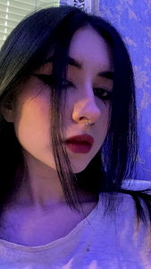 Miniangel, a young adult, exudes a sense of mystery. Her vibrant red lips stand out against her dark hair, adding an element of intrigue to the image. She's casually dressed in a white shirt, with a piercing visible on her left cheek. The background is dimly lit, which accentuates Miniangel's features and adds depth to the photograph. Her pose suggests she's lost in thought or perhaps observing something off-camera.