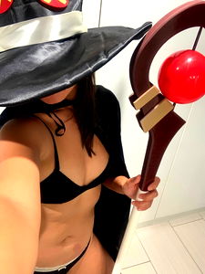 Join Min in her seductive witch costume, complete with a wand and a cape! Take a look at the image for inspiration or to admire her ensemble. Get ready for some spooky fun this Halloween!