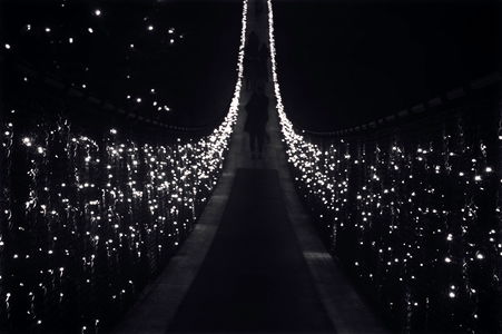 A captivating black and white photo of a person walking through a tunnel covered in twinkling lights, creating an ethereal effect with the string lights. The lights are arranged in patterns that give a sense of depth and perspective.
