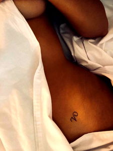 MissVmessy, a popular OnlyFans model, shares her personal side in this intimate photograph. Her tattoo stands out as she relaxes on the bed.