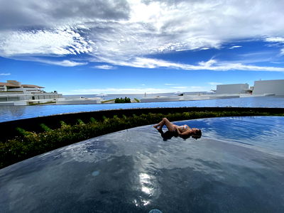 Malibu-based model, Missy Landry, is captured lounging on a rooftop pool with a stunning backdrop. She appears relaxed and carefree as she enjoys the luxurious setting.