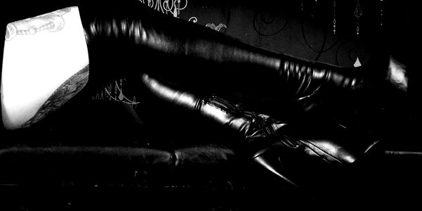 An enticing image capturing the allure of Mistress Elysia as she poses in her black leather boots and stockings. Her gaze is intense, drawing the viewer into her world.