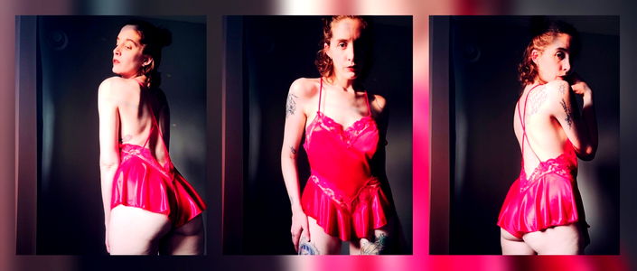 A confident and fashionable model striking a pose in red lingerie. The image captures her elegance with the backdrop providing depth to the scene.