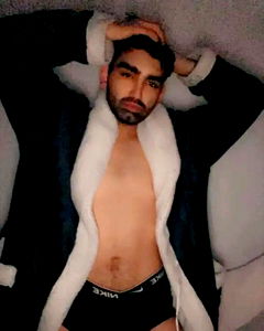 A male model with tattoos reclining, displaying a muscular build and jewelry. He has a beard and is wearing a necklace. The photo appears to be from a casual or intimate setting, possibly on social media.