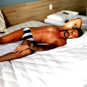 A Brazilian fitness model posing for a photo. He is in his bedroom, lying on the bed with his head resting on his hand. His shirtless appearance and confident pose suggest he is comfortable in front of the camera.