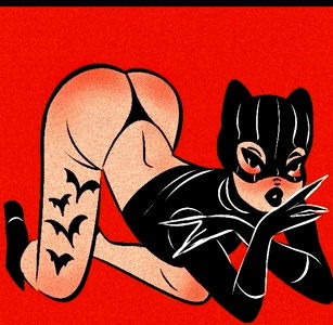 Mm.Cnstnzaaa, an OnlyFans model, is seen in a cat suit with a seductive pose and bikini bottom. The image appears to be from the 1950s, featuring a vintage illustration style.