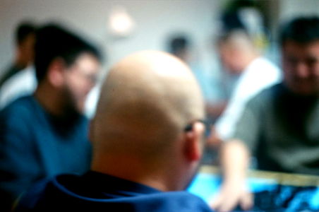 The image captures a moment of solitude and focus. A man stands in what appears to be a store or shop with headphones around his neck. He is deeply engrossed in the audio experience he's having, possibly from a set of Beats by Dre headphones. His gaze is directed off-frame, suggesting he might be waiting for someone or just lost in thought.