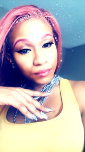 TsMia, a rising model from Birmingham, showcases her vibrant fashion sense and striking makeup. She's seen here wearing a pink wig and dramatic eye shadow, paired with a yellow crop top. Her hands are poised on her hips as she strikes an assertive pose, reflecting the boldness of her character. A true visionary, TsMia's creativity is evident in every aspect of her appearance.