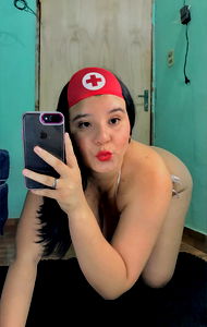 A beautiful woman posing for a picture, wearing a nurse's uniform and bikini top, with her hair styled in curls. She has red lipstick and is smiling at the camera.