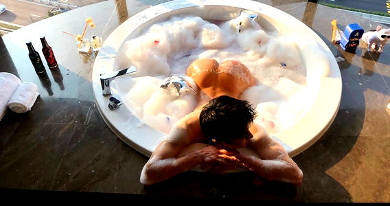 This is an image of a young, shirtless male posing for a selfie while sitting by the edge of a swimming pool. He has short hair and appears to be in a good mood. The environment suggests that he might be on vacation or enjoying some leisure time. His attire and posture convey a relaxed and casual vibe. There are no visible tattoos, piercings, or distinctive features that provide additional information about him.