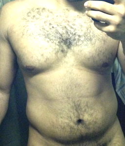 This is an image of a man who is shirtless, showcasing his chest in the mirror. He appears to be standing in a bathroom or a room with similar decor. The lighting in the photo is soft and even, highlighting his physique and the tattoos on his chest.