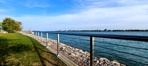 The image showcases a tranquil scene of a lakeside walkway, with the water's surface rippling under the sunlight. The clear blue sky forms a beautiful backdrop for this serene setting.