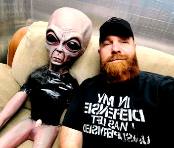 Mr McStabby, the eccentric creator of memes and internet culture, takes us on a journey through an alien encounter. In this image, he is seen posing for a photo with his beloved alien doll, which holds a special place in his heart. The backdrop to this scene is a rustic warehouse setting, adding a touch of industrial charm to the fantastical scenario. Mr McStabby's passion for pop culture and his ability to bring joy and laughter to those around him shine through in this playful interaction with an inanimate object.