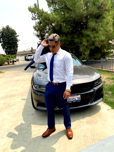 Victor Vargas, a fashion model based in California, exudes confidence and style. In this image, he is dressed in a sharp blue suit and tie, with his hands tucked into the pockets of his pants. His gaze is directed off to the side, adding an air of mystery to his persona. The backdrop of the photo features a scenic mountainous landscape under a night sky, hinting at a possible outdoor photoshoot. A road runs along the base of the mountains, suggesting that this location might be used by photographers looking for breathtaking scenery.