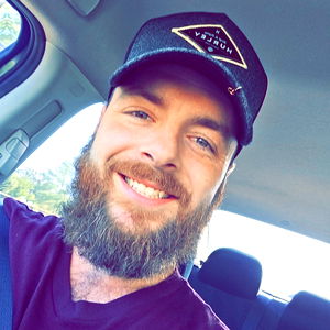 A bearded man from Texas, smiling confidently behind the wheel. He's driving a car and seems to be enjoying his journey. His beard gives him a rugged look.