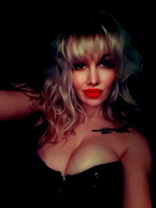 The image shows a woman with striking red lipstick, posing for the camera. Her attire and confident gaze suggest a glamorous, alluring persona, fitting for an OnlyFans model. Her hair is styled short and blonde, adding to her overall look.