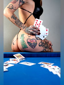 A young, tattooed woman in a black lingerie and boots posing with playing cards on a pool table. Her pose is seductive and playful.