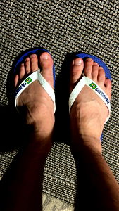 This image showcases the work of a model photographer, Napfeet. The subject in this particular frame is a pair of feet, presumably belonging to a man, wearing blue flip-flops with white soles and a small, colorful logo on the side of each slipper.