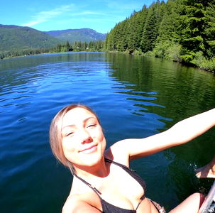 In this image, Nasty Gal Coco is seen taking a break from her adventurous activities to pose for the camera. She is wearing a black bikini top and sitting on the edge of a lake, smiling directly at the camera. Her location appears to be a mountainous area with clear blue waters and lush green forests in the background. The serene setting contrasts with Coco's energetic personality, showcasing her love for outdoor activities.