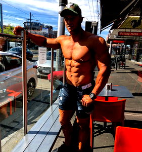 Fans of Nath Wyld, a bodybuilder from Melbourne, Australia. The photo shows him at a restaurant, leaning against a railing with his shirt off, showcasing his impressive physique.