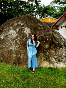 In this vibrant outdoor portrait, the Colombian model Natalia Torres is striking a pose for the camera. She's wearing a black tank top that contrasts with her blue denim jeans. Her dark hair complements her outfit and adds to her overall look. She's posing against a backdrop of greenery, which brings a refreshing vibe to the image.