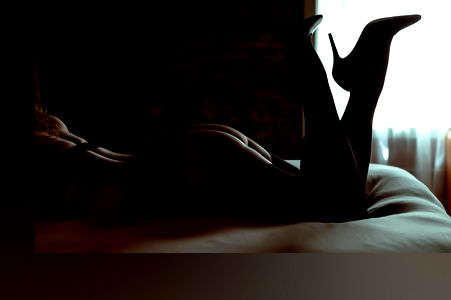 This image showcases a model wearing lingerie and fishnet stockings, evoking a sense of intimacy and allure. The model is captured in an intimate pose, adding to the overall atmosphere of the photo.