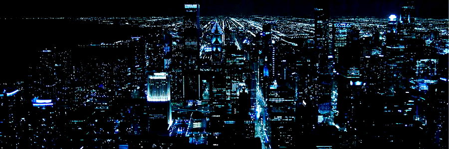 A night view of a city skyline, capturing the glow of lights and the silhouette of buildings. The image has been altered to include a watermark-like effect with shattered glass pieces overlaying the cityscape.
