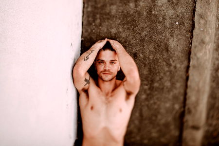A muscular Onlyfans model in a gym-like setting displays his well-defined body and impressive physique for fans to enjoy.
