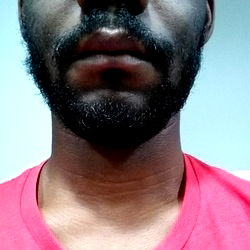 This image features a man with a beard and mustache, showcasing a close-up view of his facial hair. The individual is captured from the chest up, against a white wall background. The person appears to be in a casual attire, possibly at home. This kind of photography is commonly used for personal branding or to present one's appearance in a professional context.
