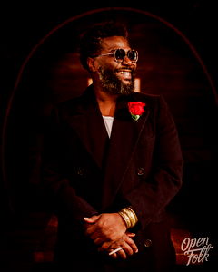 A model named Phontz is seen sporting a vibrant red and patterned headscarf, sunglasses, and a tie-dye shirt. His outfit exudes a hipster aesthetic, which may suggest that he is from the 60s or 70s era. The model is also wearing large sun goggles and has an earring visible in one of his ears. The background shows a casual setting with palm trees and greenery. It appears that Phontz might have a playful personality, given his quirky outfit and pose.