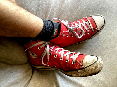 These are a pair of Converse All Stars shoes in the classic red and white colorway. The shoes feature white laces, a red rubber sole, and a white canvas upper with red accents. They have been worn and show some signs of use. The model is also wearing dark socks with a visible logo. These sneakers are a popular choice for casual wear or as part of a vintage fashion look.