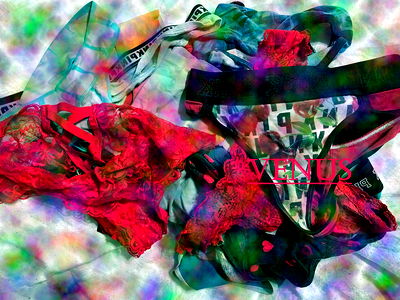 This is a photograph of an adult female who appears to be in her late twenties. She has tattoos on both arms and is wearing a black tie-dye t-shirt with a graphic that resembles a face with the middle part crossed out, suggesting it may represent censorship or deletion. The individual is also wearing underwear, which is visible through the shirt. Her belly button is exposed due to her clothing choice, which has been pulled down slightly, revealing her midsection. She has a tattoo on her lower back and is displaying part of her thighs. She seems to be indoors with a tiled floor in the background. The image does not provide explicit information about the model's age or gender beyond the visible characteristics.