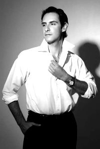 A male model with a neutral expression and dark hair, set against a plain background. He is wearing a white shirt, and his pose appears relaxed yet composed.