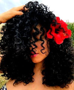 A fashionable black and white illustration of a woman's hairstyle, emphasizing the curls and sleek design. The Nina Bloom style showcases a modern, chic look perfect for trend-setters.