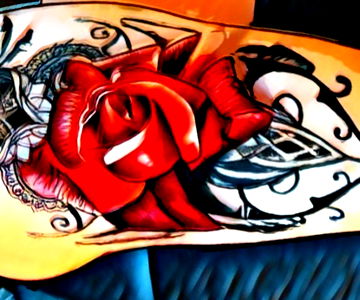 A close-up of a person's shoulder showcasing a vibrant red rose tattoo. The tattoo is intricate, with shading and details that make it stand out. The person appears to be sitting down and the photo captures the beauty of the tattoo in a realistic style.