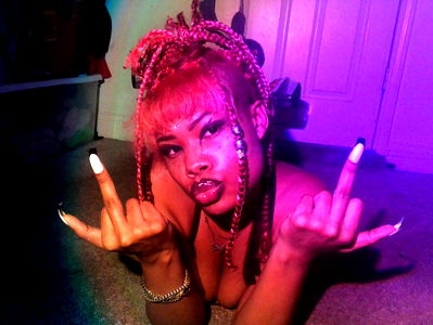 Artistic digital image of a model posing in a room, with vibrant hair extensions and colorful makeup. She is wearing a purple wig with cat ears and has pink hair with purple streaks. The model wears a necklace with a cross pendant, and there's a visible tattoo on the right arm. Her pose is relaxed with one hand placed near her face.