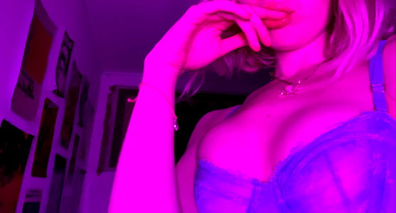 Ivy takes the spotlight in this vibrant, purple-lit studio shoot. Her unique blend of style and confidence is on full display as she sits confidently on a white chair with her legs crossed over a black stool. The room's neon pink and purple lighting cast a dramatic glow on the scene. Ivy's OnlyFans fans can expect a peek into her world.